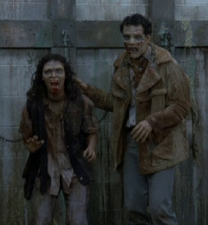 My Take: The first time I saw this movie, it really bothered me, like disturbed bothered me. I’m not sure if it was the content, as this was before I became immune to zombies or if it was the odd colour of some of the zombies; a sort of blue hue that is effective enough to give me the creeps. I actually think the zombies were better actors than the actors in character. Onward. In the opening when the 2 pilots and Sarah (I believe she’s suppose to be an anthropologist packing heat?) are in the city, there is an alligator/crocodile wandering about and this made me wonder if in Romero’s Dead verse, are animals and reptiles zombified? That didn’t disturb me, just made me have deep thoughts which I try to avoid. There is a huge amount of blood, gore and violence in this flick. I watched it again last week and was surprised by how graphic it is and the amount of dismemberment, guts being pulled out, flesh being peeled from bone and the horrible things the bat shit crazy doctor was doing to the zombies. It was pretty friggin’ gross. So I guess that bothered me the most (I’m getting soft in my old age) but so did the re-humanization of Bub. There is just something wrong with that. Maybe it didn’t disturb per se but I don’t think zombies should be cognitive and have a sense of humanity that was lost when they became infected with whatever causes flesh-eating corpses to hunt the living. Romero really went down hill using this theme with Land of the Dead.