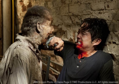 In Woodbury this week, Merle is going to town on Glenn trying to get him to spill the goods on where the rest of the group and Daryl are. Glenn tries to play it up saying Jim and Dale and Andrea are all with Rick but of course Merle knows the truth. In his anger at Glenn’s refusal to tell him where his brother is, Merle releases a Walker to attack Glenn who is taped to a chair. Never fear, Glenn kicks ass and kills the Walker after he frees his hands. Maggie is left in the hands of the Governor to be degraded as he tells her take off her shirt and bra. He bends her over the table, implying he is going to rape her but he doesn’t. Maggie and Glenn are reunited and the Governor finally gets his answer about where the survivors are after he puts a gun to Glenn’s head and Maggie tells him. Glenn wouldn’t even give up the information as he looked at Maggie half-naked, being touched by the Governor and not with a gun to his head.