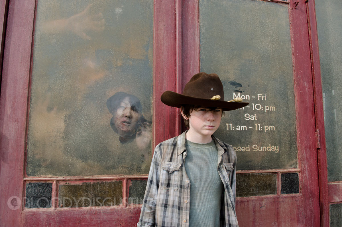 Carl decides to take a stroll through town to get a crib for Judith with Michonne tagging along. The real reason Carl leaves is to go to a restaurant to get a picture of him, Rick and Lori so that Judith will know what her Mother looked like. There was a good comment on Talking Dead about Carl finding a picture of Shane so that she will know what her Dad looks like too. Boom! Carl is reckless and puts himself and Michonne in danger as the restaurant is filled with Walkers who seem to have slept for the last year. Michonne is there to help him, not watch him like he is a kid, and she makes that point. Oh and they did get a playpen for Judith along with the photo and Michonne picked up an ugly colourful cat thing.