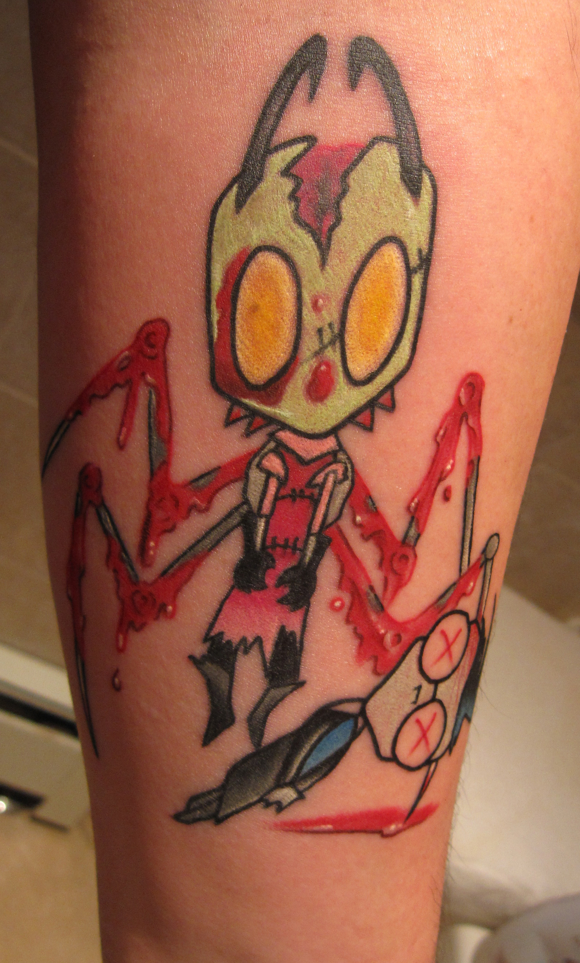 Alright, so I have been lax in my writing over the past week what with the holiday -Halloween- and I haven’t posted anything. What I have been doing is relaxing and getting a new tattoo. The zombie robot Gir is mine and the alien fellow, Zim, is my husband’s tattoo. We got these done for our anniversary on Halloween by Ian Olsen of Wolf/Sheep Arthouse. Very pleased with how they turned out and the designs.