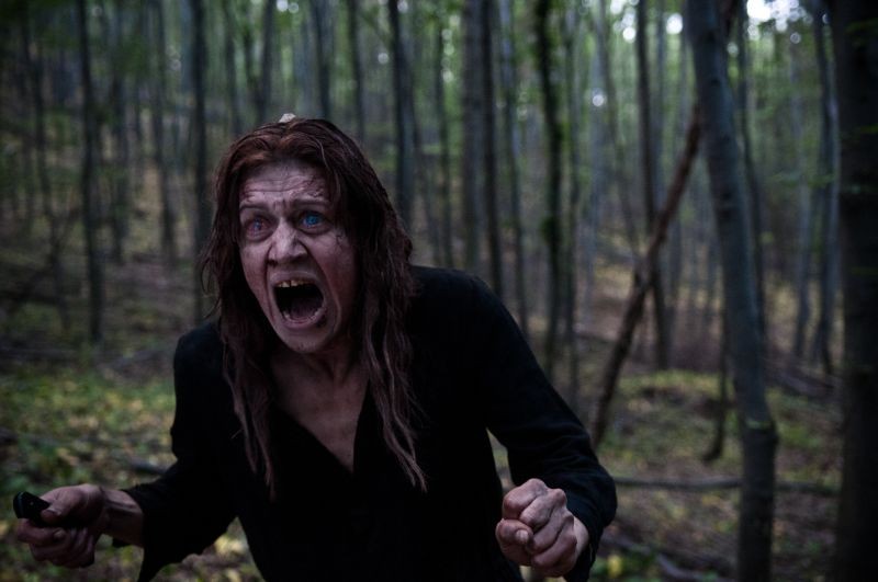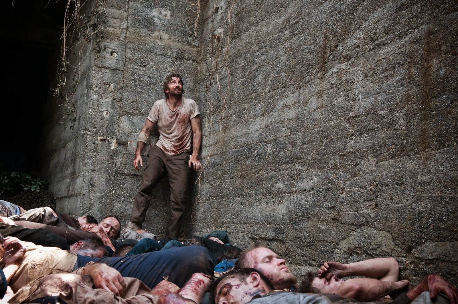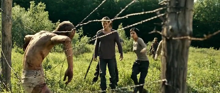 The characters don’t know themselves or each and adding to the complications of not knowing or trusting one another is that there is one of them who seems to know what is happening but she is mute and can only write in Chinese (I think?) So the only one who can explain things can’t communicate with any of them. As the group begins to explore the outlying areas from the house where they are holed up and the open grave where Jonah is found at the beginning, more strange shit crops up leading further down the route of one of them being a psycho. In the woods there are dead bodies strapped to trees with barbed wire and they find a man (pictured above) half-naked and tangled in barbed wire but he is not incapable of movement as he stabs one of the amnesiacs with a branch. Add to this the woman they find chained and living in filth in a shack and the discovery of some sort of building with a kid who runs away and later some totally messed up people doing some weird shit and your kind of going, huh?